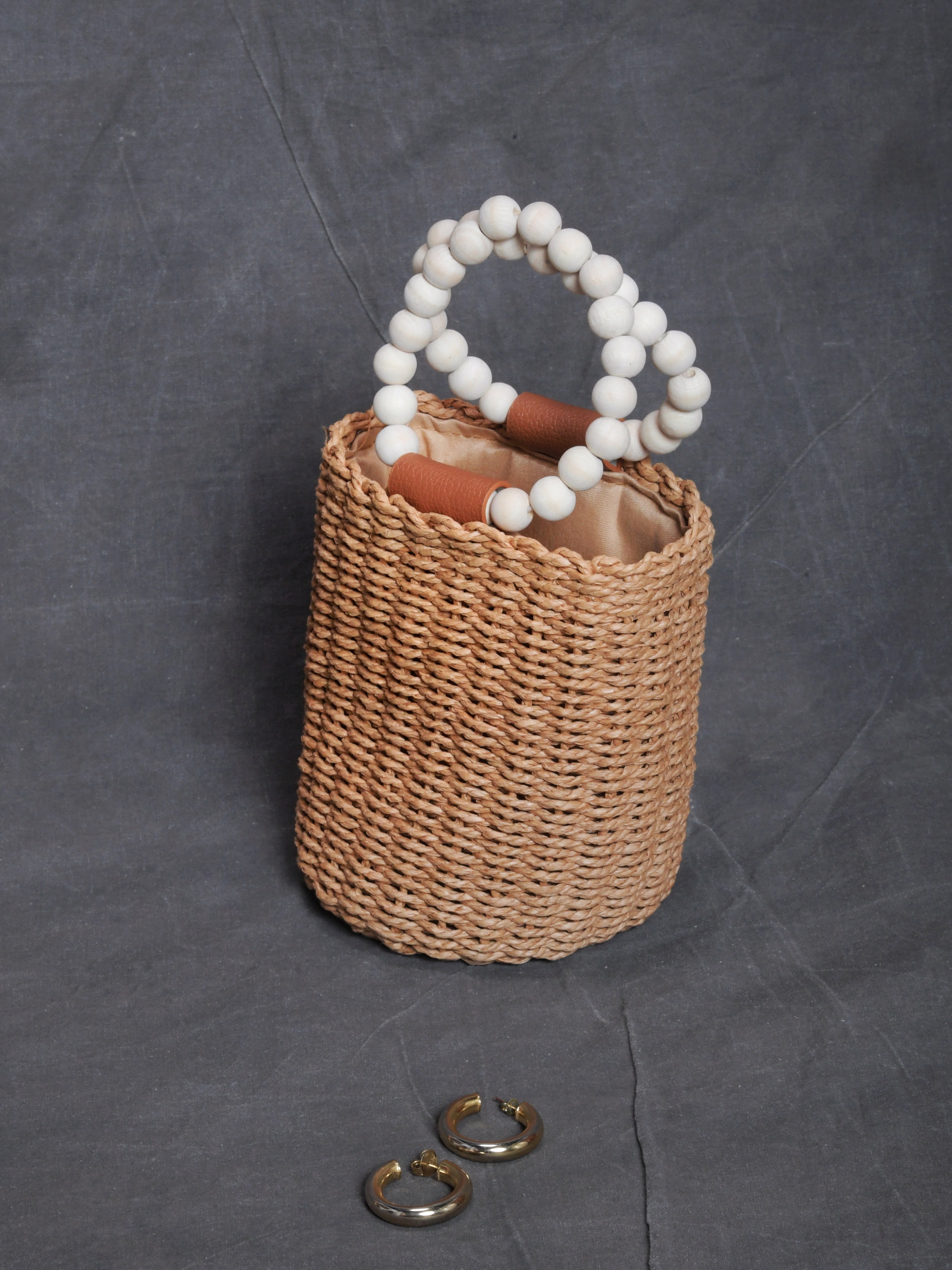 Straw bag with structured small body, beaded top handle, internal cloth closure.