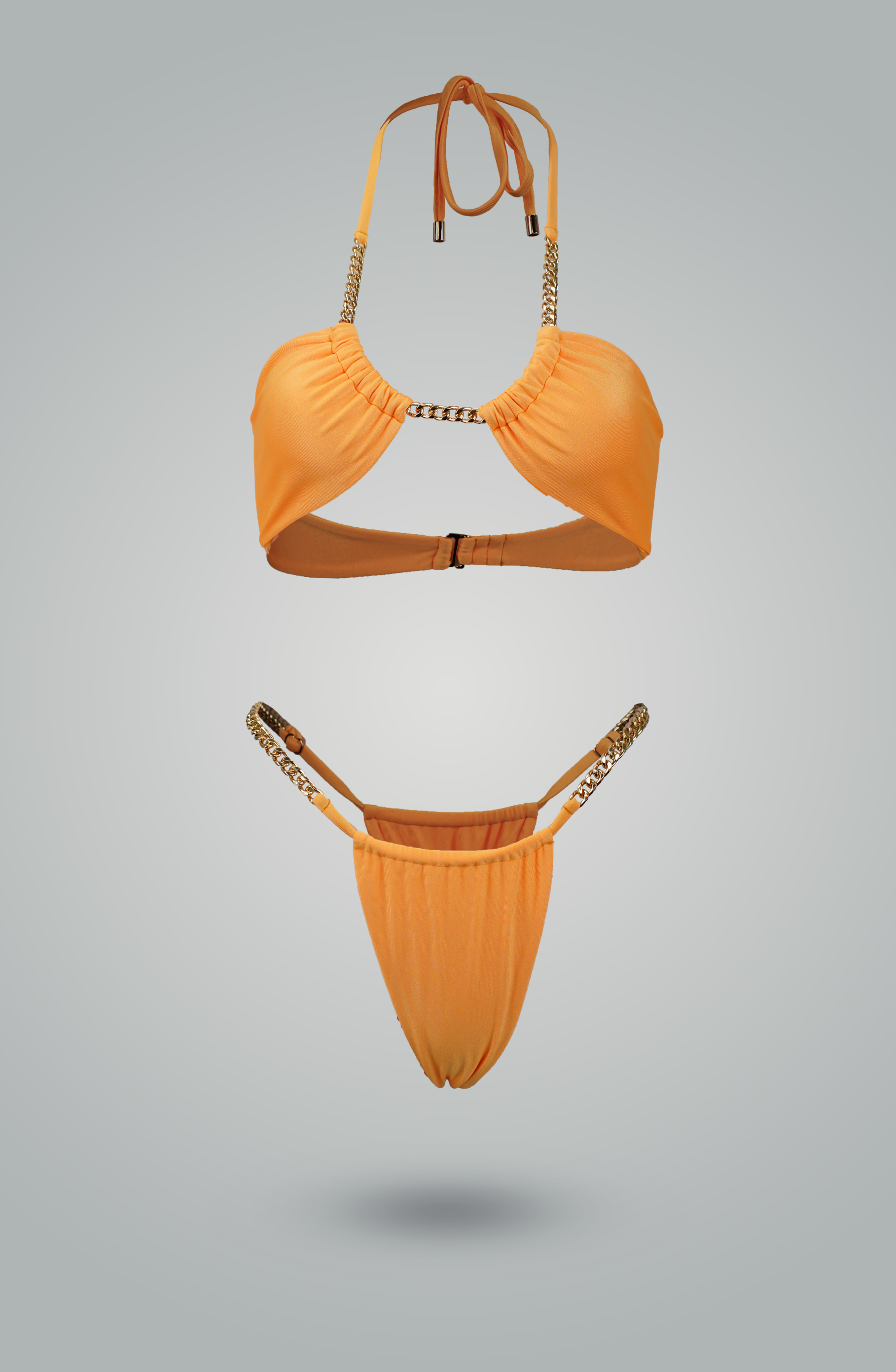 Indulge in the timeless elegance of our goldfish orange bikini bottom, featuring a subtle but striking design. Complete with a regulator and luxurious gold chain, this piece will elevate your beach look with effortless sophistication.