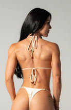 A classic triangle bikini top in a luminous shimmery white shade that enhances sun-kissed skin. It features adjustable ties at the neck and back for a custom fit and is adorned with delicate faux pearl details at the top of the cups and the center, adding a touch of elegance to your beachside look. Lightly textured fabric offers a refined, timeless vibe.